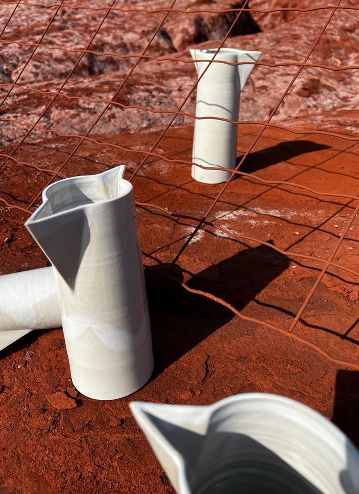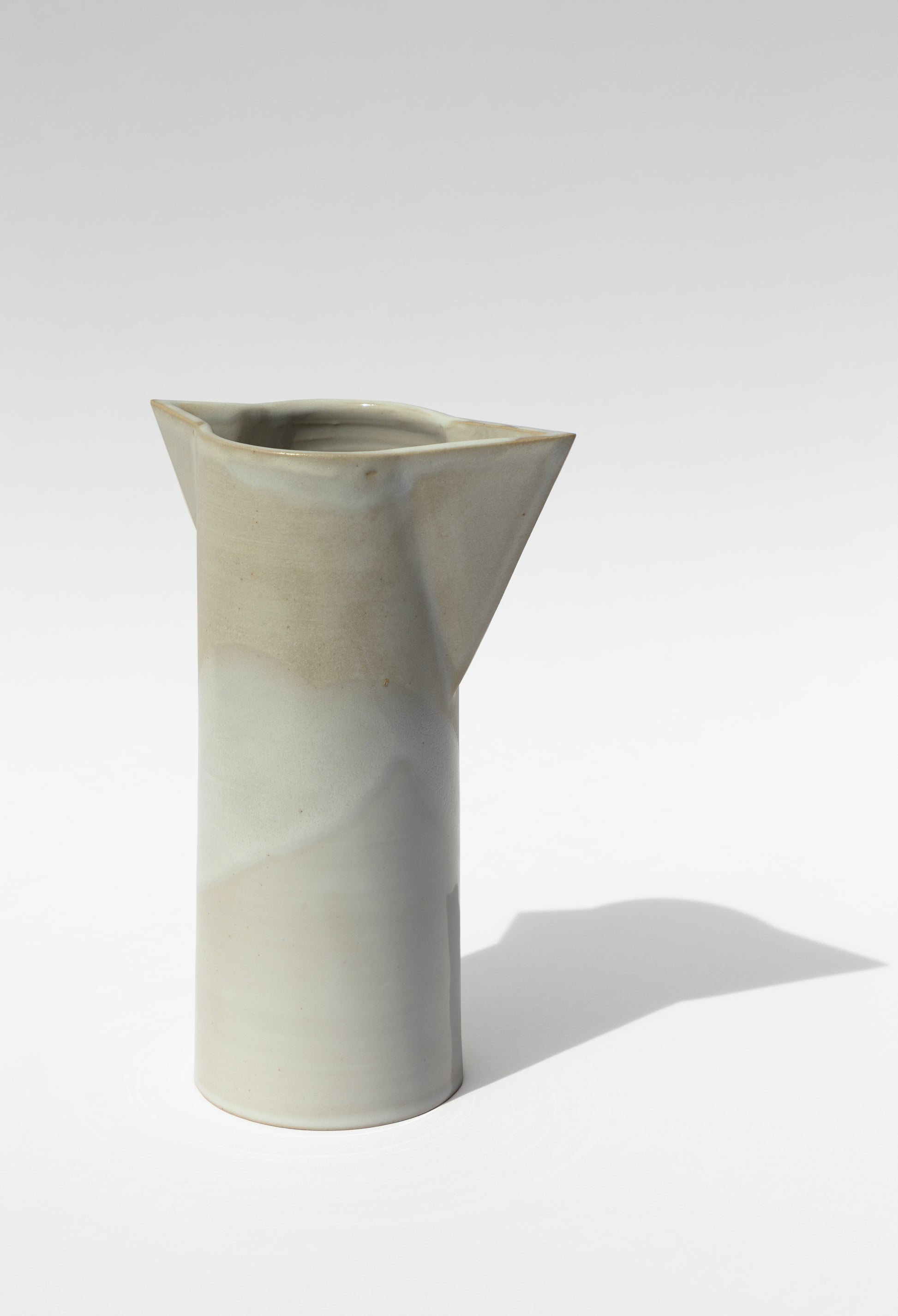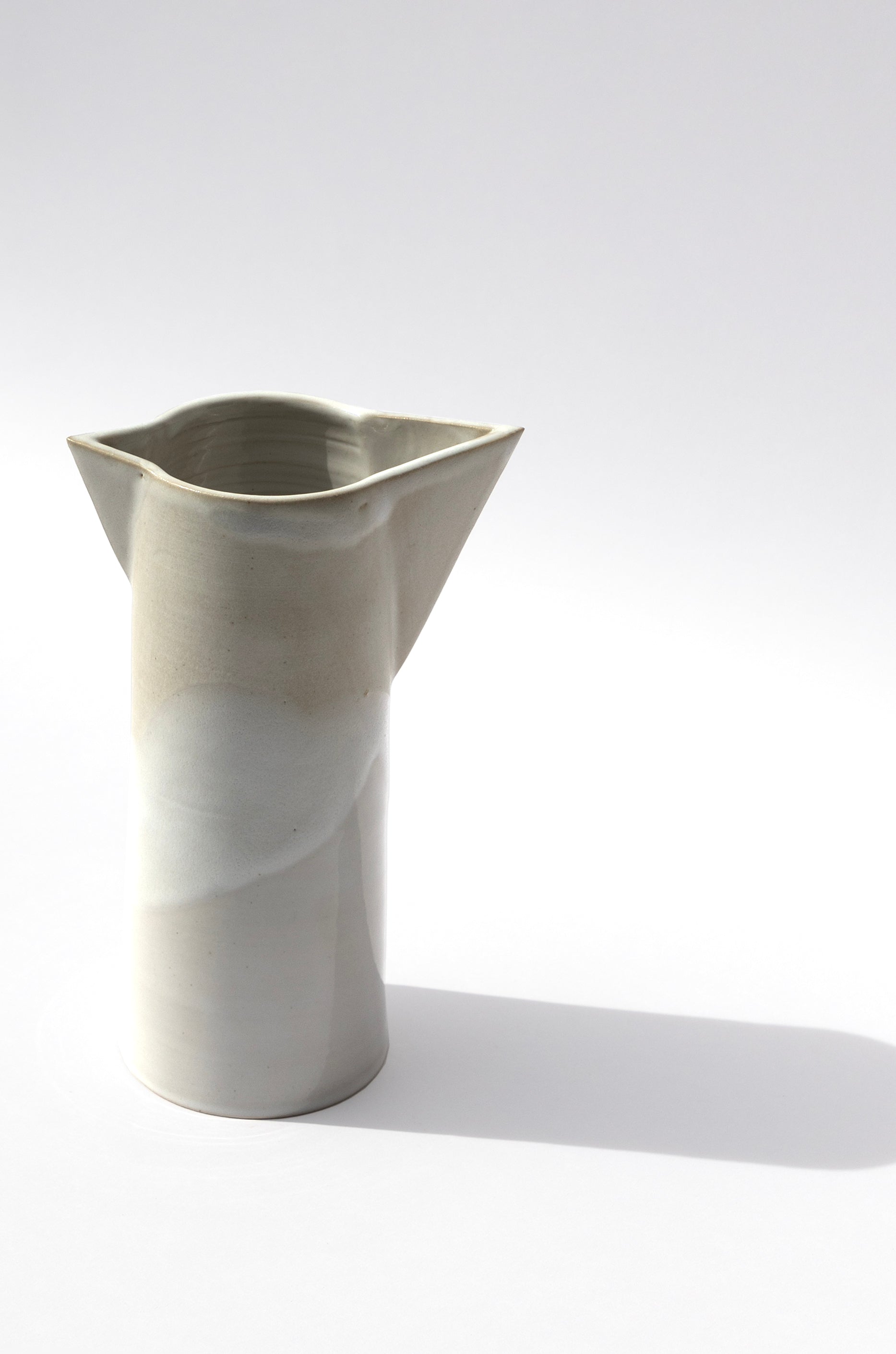 Chaque pichet double bec est tourné à la main en grès blanc, puis recouvert d’un émail blanc cassé nuancé entre mat et brillant.
