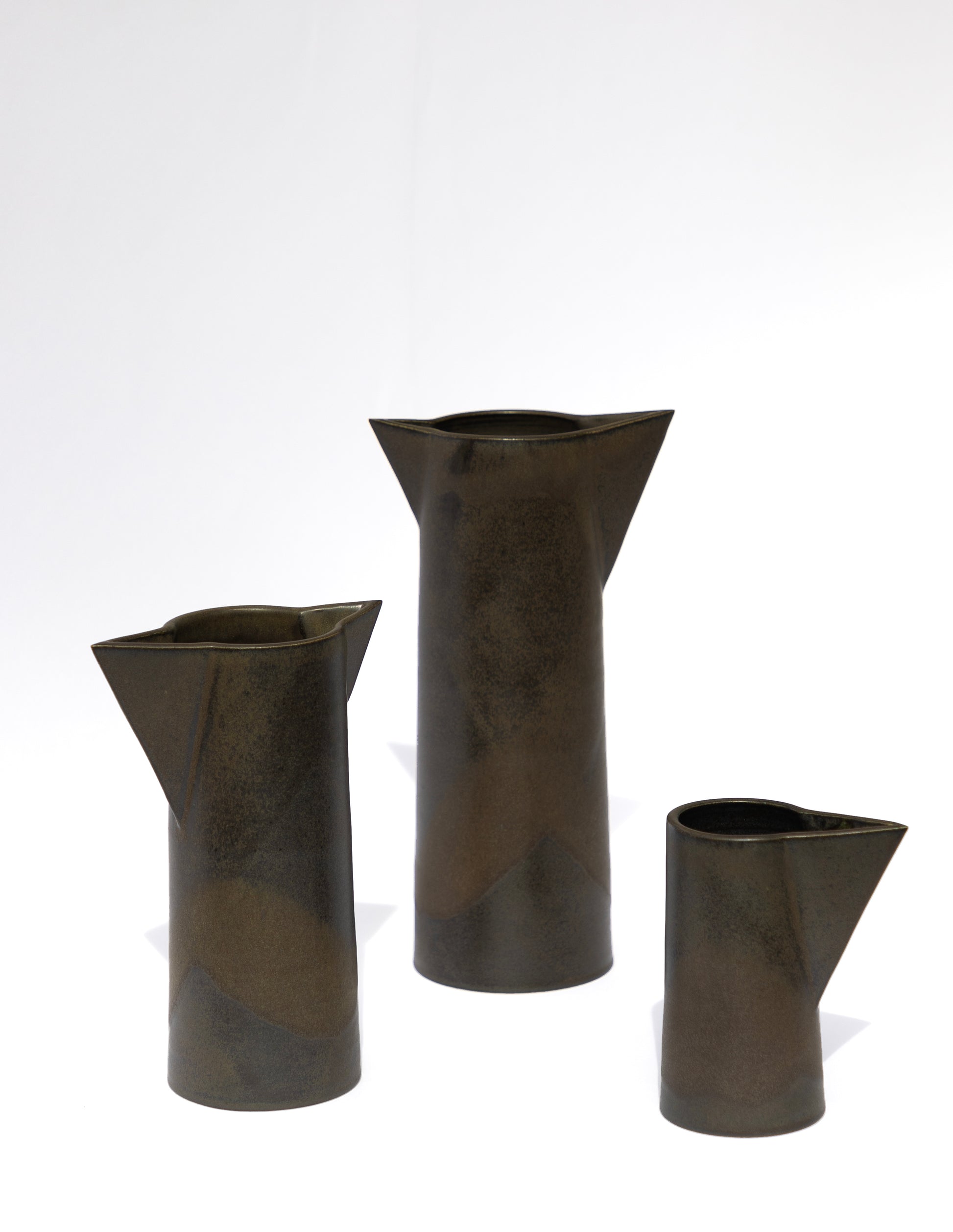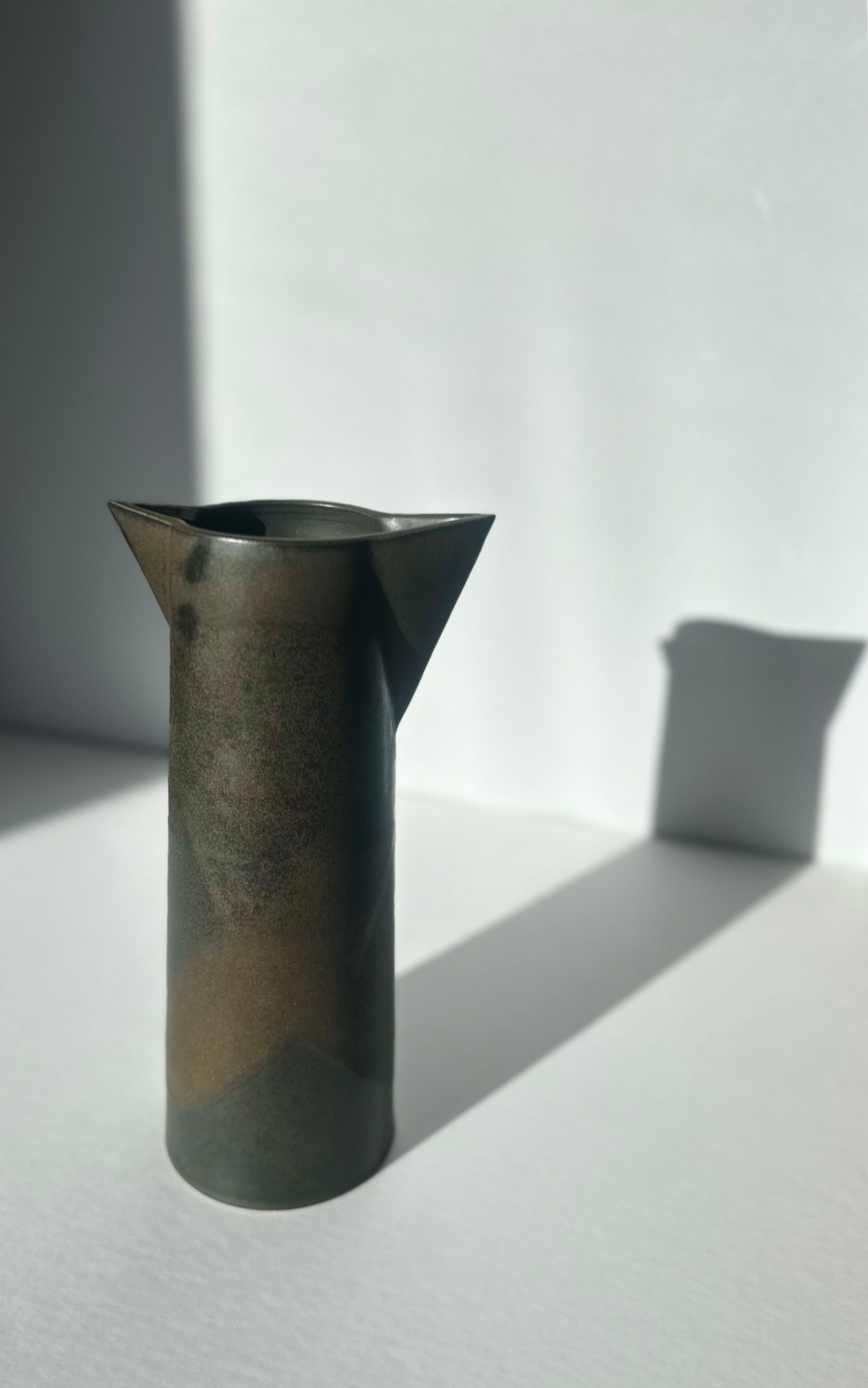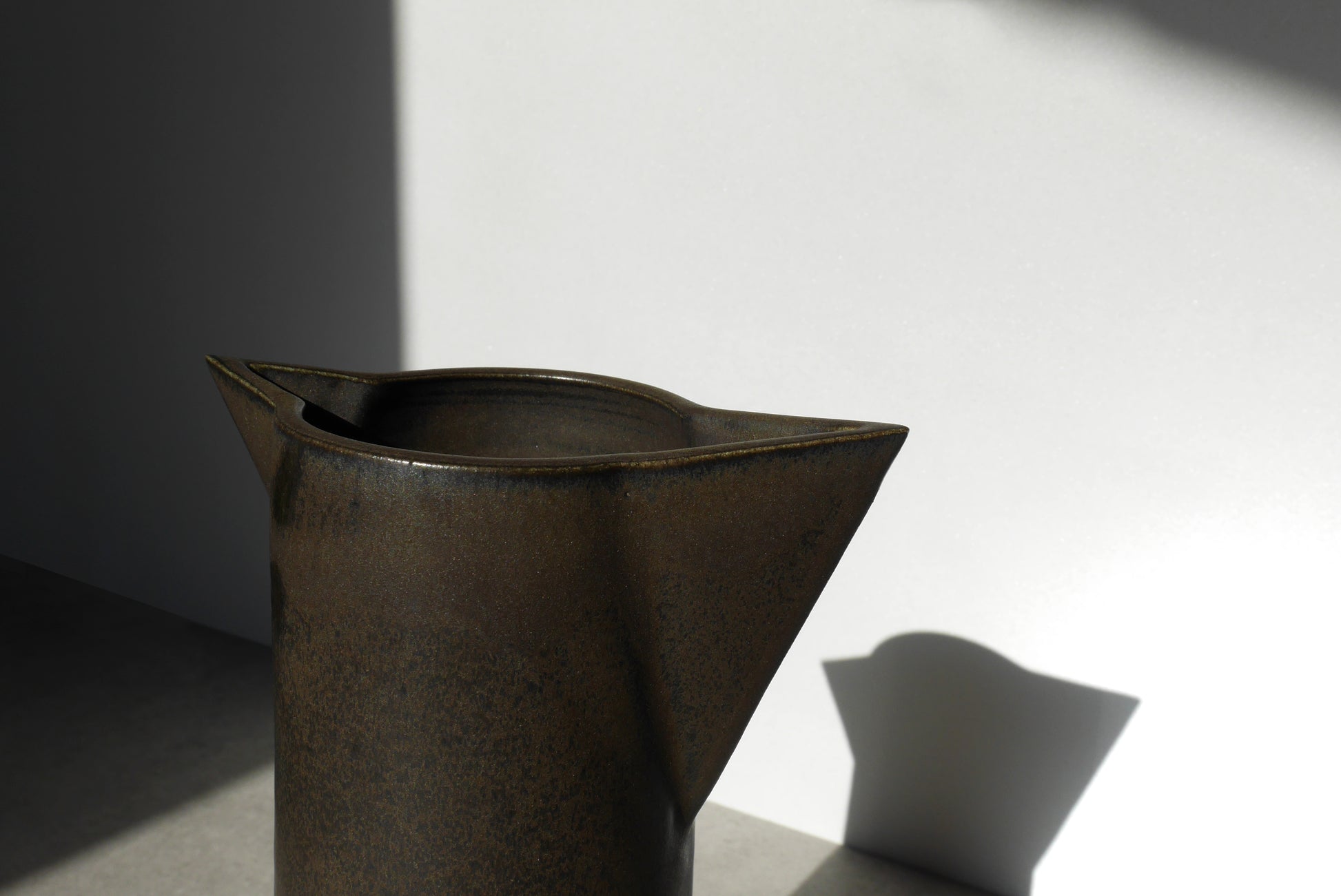 Chaque pichet double bec est tourné à la main en grès blanc, puis recouvert d’un émail terre brûlée, satiné et délicatement nuancé.
