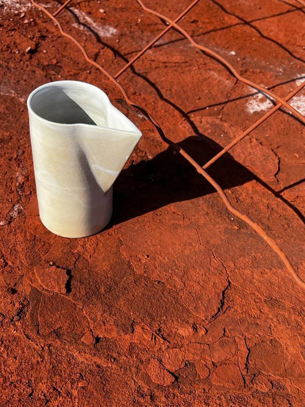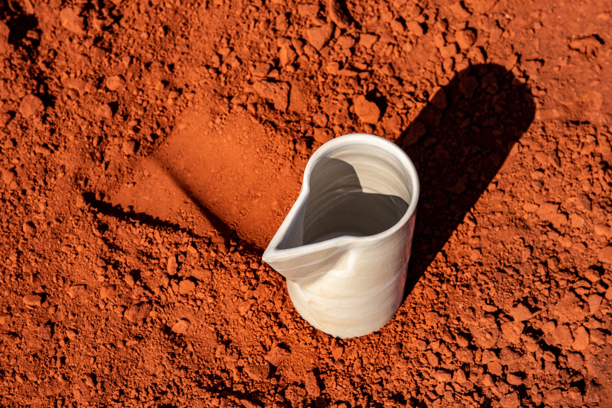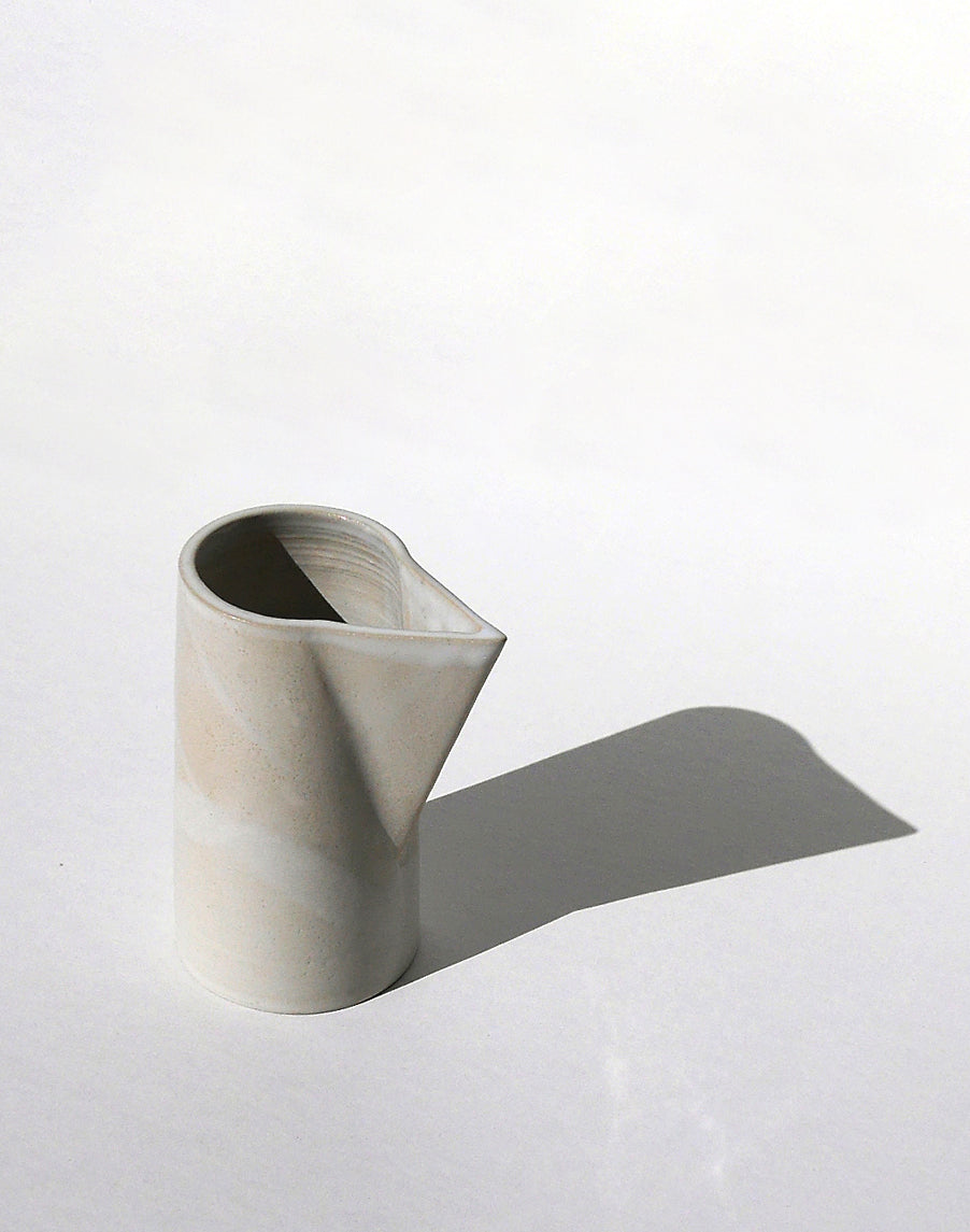 Chaque verseuse est tournée à la main en grès blanc, puis recouverte d’un émail blanc cassé nuancé entre mat et brillant.